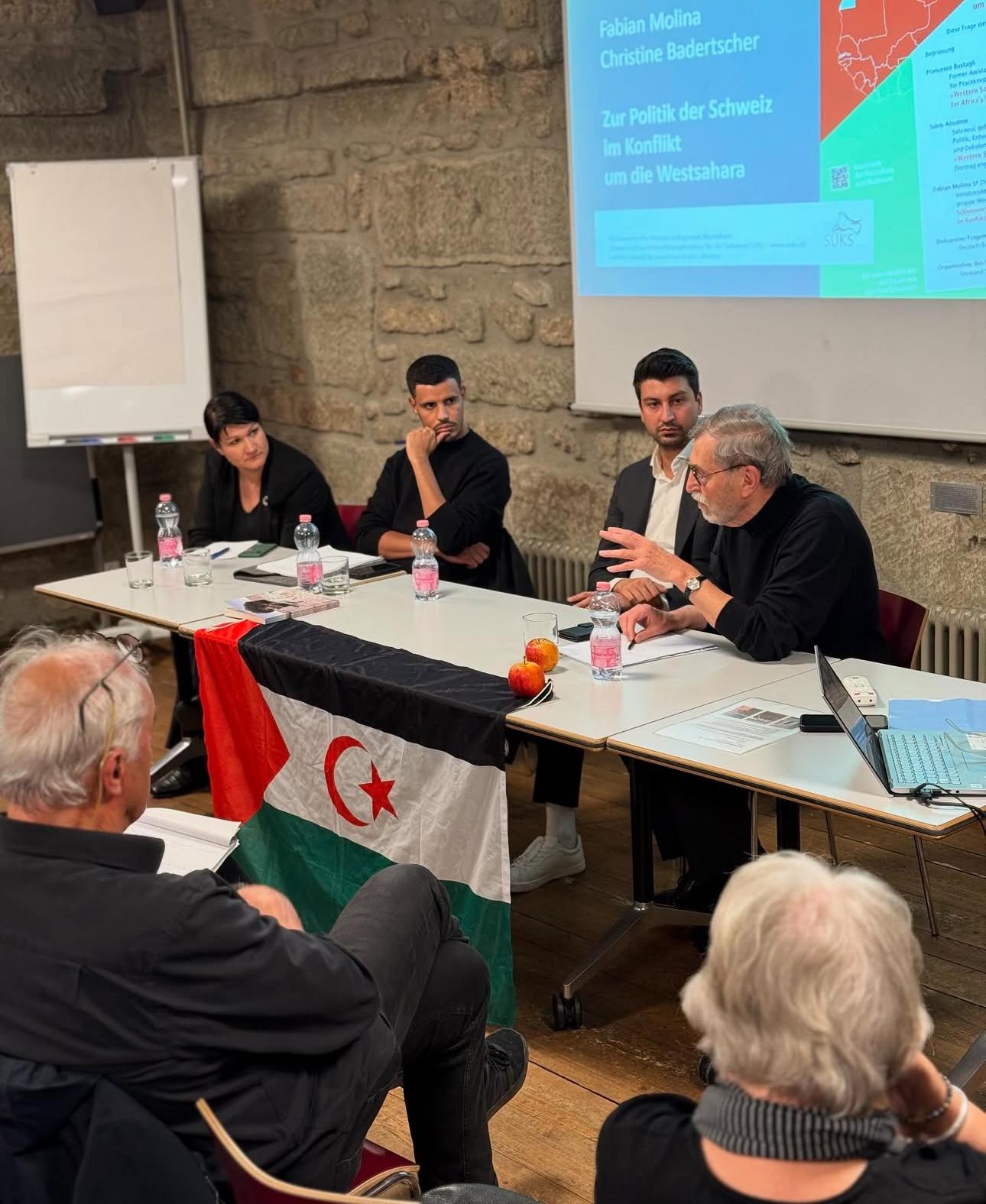 Participation de Francesco Bastagli un ancien assistant du Secrétaire général de l’ONUpour les opérations de maintien de la paix et chef de la MINURSO, Taleb Alisalem sahraoui spécialisé en politique internationale et coopération au développement, Fabian Molina et Christine Badertscher, membres du groupe parlementaire d’amitié avec le Sahara Occidental, 19/03/2025
